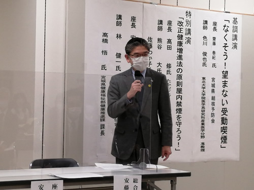 宮城県健康推進課課長の高橋 悟様は、令和元年の宮城県民の喫煙率は全国でワースト4位であり、宮城県民の健康度が低いことを話されました。宮城県の対策を紹介し、令和4年までには受動喫煙の機会のある人の割合を0%にする事を目指しているとのことでした。