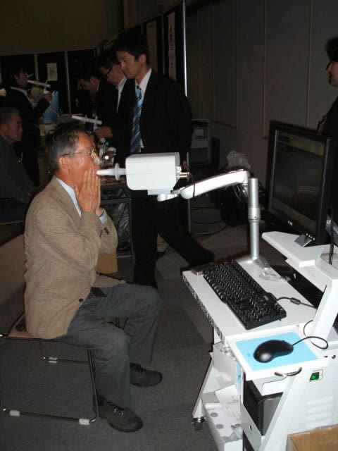 禁煙みやぎ理事長の山本蒔子先生の開会挨拶のあと、NTT東日本東北病院の安達哲也先生の座長で筆者が基調講演「喫煙と肺の病気」を行った。内容は、喫煙関連疾患、いわゆるたばこ病のうち、肺疾患にはどのようなものがあるかを紹介し、その後、その代表である慢性閉塞性肺疾患(COPD)について詳しく解説を行った。COPD啓発にもなる肺年齢の概念の解説のほか、実演では、新開発の呼吸機能測定器を用いてたばこの呼吸器の障害がどのように表れるかが紹介した。肺のたばこ病では、肺癌、慢性閉塞性肺疾患(COPD)、が臨床上の大きな課題である。受動喫煙では子供の気管支炎や気管支喘息、中耳炎などが注意すべき点であり、最近では、残留受動喫煙(Third hand smoke)の子供に対する悪影響も懸念される。COPDはたばこが原因であり、2020年には世界の疾患別死因統計でワースト3に入ると予測されている。考えてみれば実に驚嘆すべきことである。喫煙者の6人に1人が罹患し、その進行予防には禁煙しか有効な手段がない。COPD病初期は無症候性に進行し手遅れになりやすいため、早期発見で禁煙に誘導しなくてはならない。肺年齢を患者に知らせることは、COPDの初期徴候の異常をいち早くインパクトをもって知らせる。モストグラフは筆者らが産学連携で開発した最新の呼吸機能検査機器であるが、COPDの初期がカラーで映像化され、無症候の患者にたばこの害を自覚してもらうためのよいツールとなると期待される。実演では、無症候である喫煙者で異常なカラー画像が実際に出現し、症状はなくても実際に病変が進んでいることが示されていた。