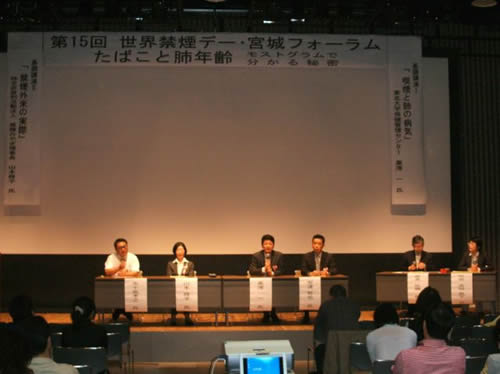 会場には天気も悪い中、100人を越える聴衆が集まり、協賛団体や企業の禁煙に関する各種展示も例年どおり行われた。肺年齢や肌年齢を無料で測定するコーナーが設けられ、参加者の関心を集めた。最後に、パネリストが壇上に上がって総合討論となり、参加者からの意見や質問を聞き、今後の宮城県における喫煙対策、あるいはわが国への喫煙関連施策に対する意見などについて討論が交わされた。