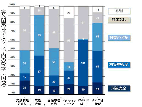 また、WHO包括的タバコ対策パッケージ(MPOWER)2011では、効果的なタバコ規制対策の実行を求めています。図1のように、各種タバコ規制対策は不十分な状況です。