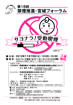 毎年開催しておりました、「世界禁煙デー・宮城フォーラム」の開催には、今年5月には、4月に主催しました第6回日本禁煙学会学術総会の事後処理等のために時間が取れませんでした。そこで、11月10日に「第18回禁煙推進・宮城フォーラム」として開催致しました。
