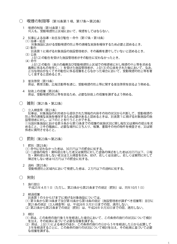 平成24年3月県議会で可決、1年間の周知期間を経て、平成25年4月から官公庁、病院、学校で、26年から民間も含めて全県下で施行。詳細は資料1.資料2.を参照。