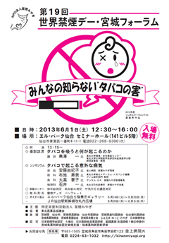 2013年6月1日(土)に仙台において第19回「世界禁煙デー・宮城フォーラム」が開かれ、多くの皆様にご参加いただきました。