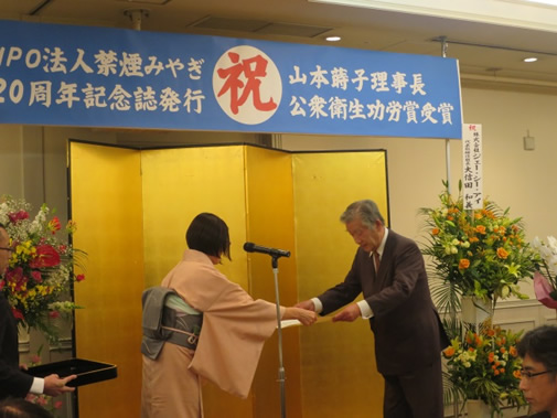 禁煙みやぎでは皆様のご協力により平成27年2月に20周年記念誌を発行しました。また3月には山本蒔子理事長が『安西・野家記念公衆衛生功労賞』を受賞しました。山本理事長が宮城県生活習慣病健診精度管理協議会の肺がん部会委員に長年ご尽力したこと、また禁煙活動により地域の健康増進に大きく貢献した事が受賞理由です。当法人と致しましても、これまでの理事長の長い地道な活動を評価して頂いたものと大変喜ばしく思います。