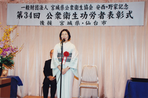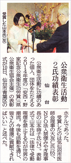長年の間、様々な禁煙支援活動を続けてきた「禁煙みやぎ」理事長山本蒔子が、宮城県公衆衛生協会主宰の「安西・野家記念公衆衛生功労賞」を受賞しました。