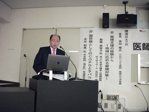 最後は「国民病としてのCOPDとタバコ」を宮城県医師会理事の米谷則美先生が講演されました。COPDは喫煙者の15~30%に発症するので、患者数は530万人と推定されるが、認知度が低く治療されないままになっている。高齢社会において、健康な高齢者を増やすために、禁煙・受動喫煙防止が大切であることを強調されました。