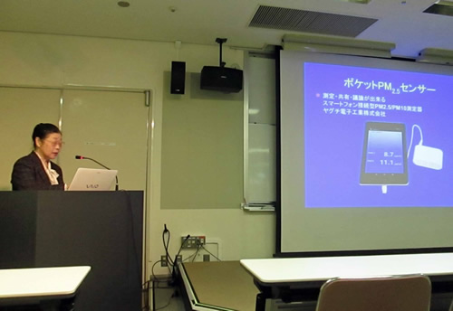 NPO法人禁煙みやぎ会員の大高要子氏は、PM2.5センサーを用いて仙台市内のコーヒー店やゲームセンターの空気環境を測定し、その結果を報告しました。分煙のコーヒー店の喫煙区画は非常にPM2.5の測定値が高く、しかも禁煙区画まで空気環境が悪化し分煙が意味の無いことを指摘しました。ゲームセンターの調査ではパチスロ店のほとんどは喫煙店で非常に空気環境が悪い状態でしたが、仙台初の禁煙パチンコ店(実情は喫煙室のある禁煙パチンコ店)1店や禁煙のゲームセンターが2店あり受動喫煙防止の社会的影響が多少ともみられることを報告されました。