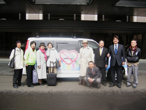 スモークフリーキャラバン隊(隊長;渡辺文学氏)が、仙台の学術総会開催に向けて4月2日から、関東東北の各県庁を訪問し、受動喫煙防止条例の早期制定の要望を行う活動を展開しつつ、仙台に到着しました。本学術総会の前日4月6日には、スモークフリーキャラバン隊の皆さんと日本禁煙学会の作田理事長、および地元禁煙みやぎの理事長の山本、田浦副理事長、大高理事が共に、宮城県庁を訪れました。県知事宛に受動喫煙防止条例の早期制定を求める要望書と、禁煙みやぎが2010年の世界禁煙デー・宮城フォーラム「ストップ!ザ・受動喫煙」以来集めた宮城県に受動喫煙防止条例制定を求める3,000名の署名を手渡しました。